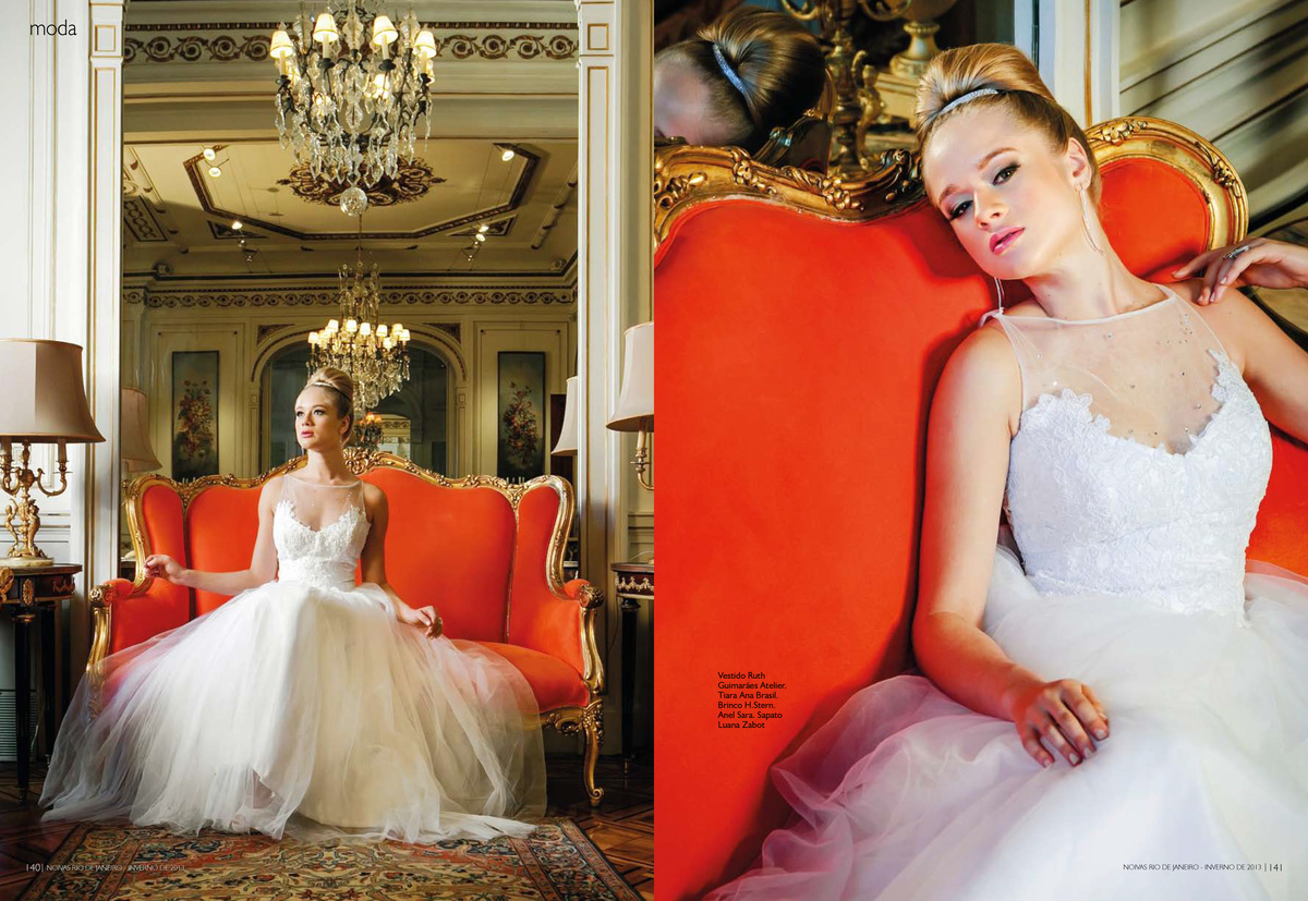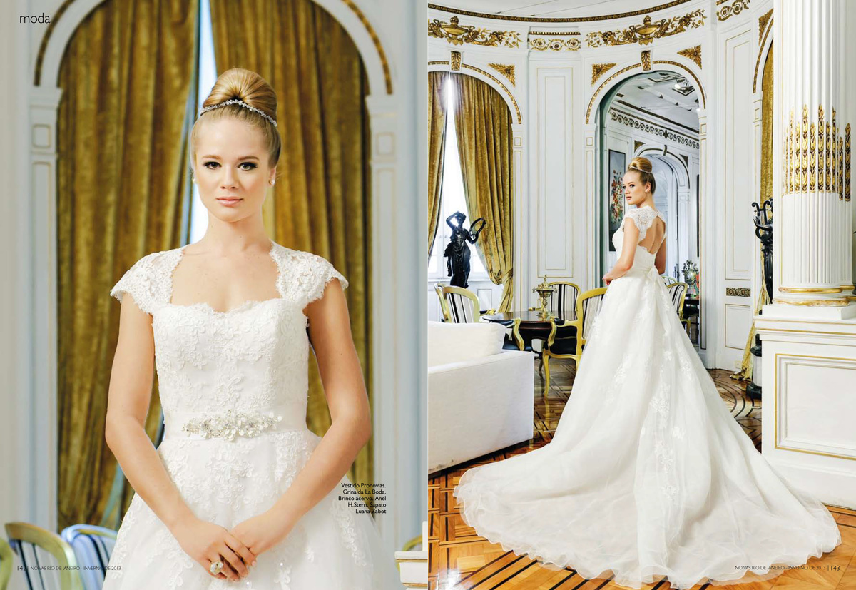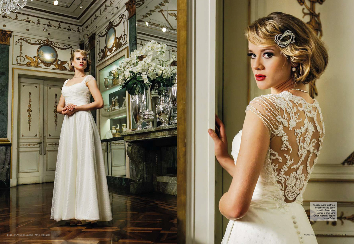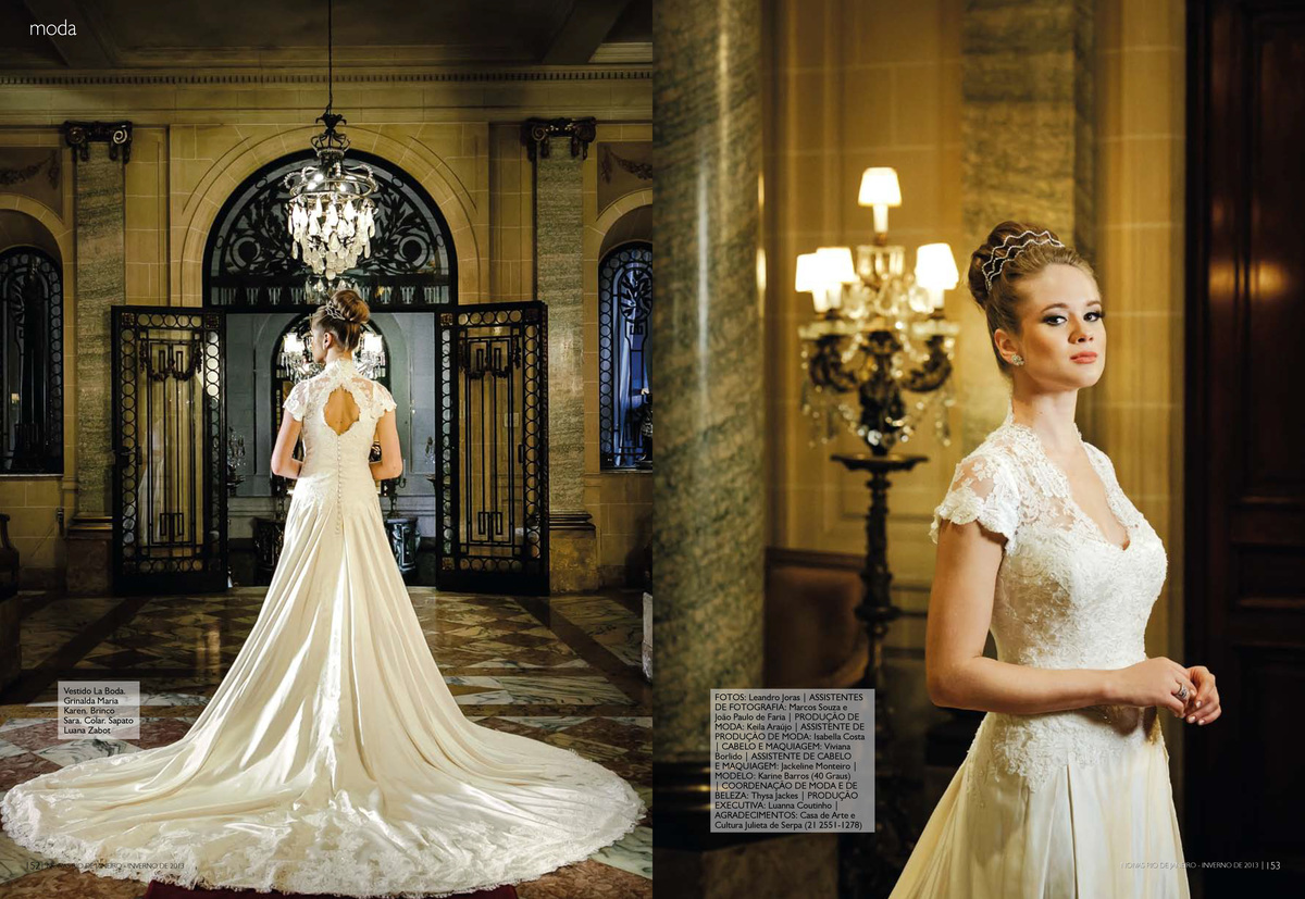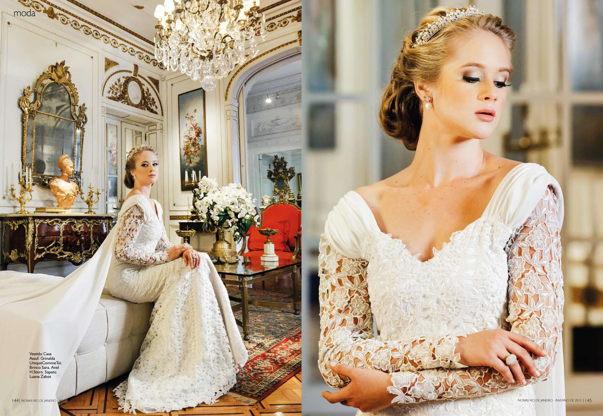 "Toda mulher deseja casar com um vestido lindo e quer que ele continue bonito nas fotos do casamento muitos anos depois. Quem conseguiu isso, e virou referência de uma noiva clássica e atemporal, foi Grace Kelly. 57 anos depois, o vestido de renda e mangas compridas continua inspirando as moças de hoje; entre elas a também princesa Kate Middleton. Mas não precisa casar com um príncipe de verdade para ter um vestido com ares de realeza. Selecionamos modelos clássicos e sofisticados que deixam qualquer plebeia linda como uma princesa. Para o cenário deste editorial, escolhemos um dos palacetes mais bonitos do Rio de Janeiro, a Casa de Cultura Julieta de Serpa. As fotos de Leandro Joras estão incríveis e inspiradoras. Fiquei até com vontade de casar de novo…"